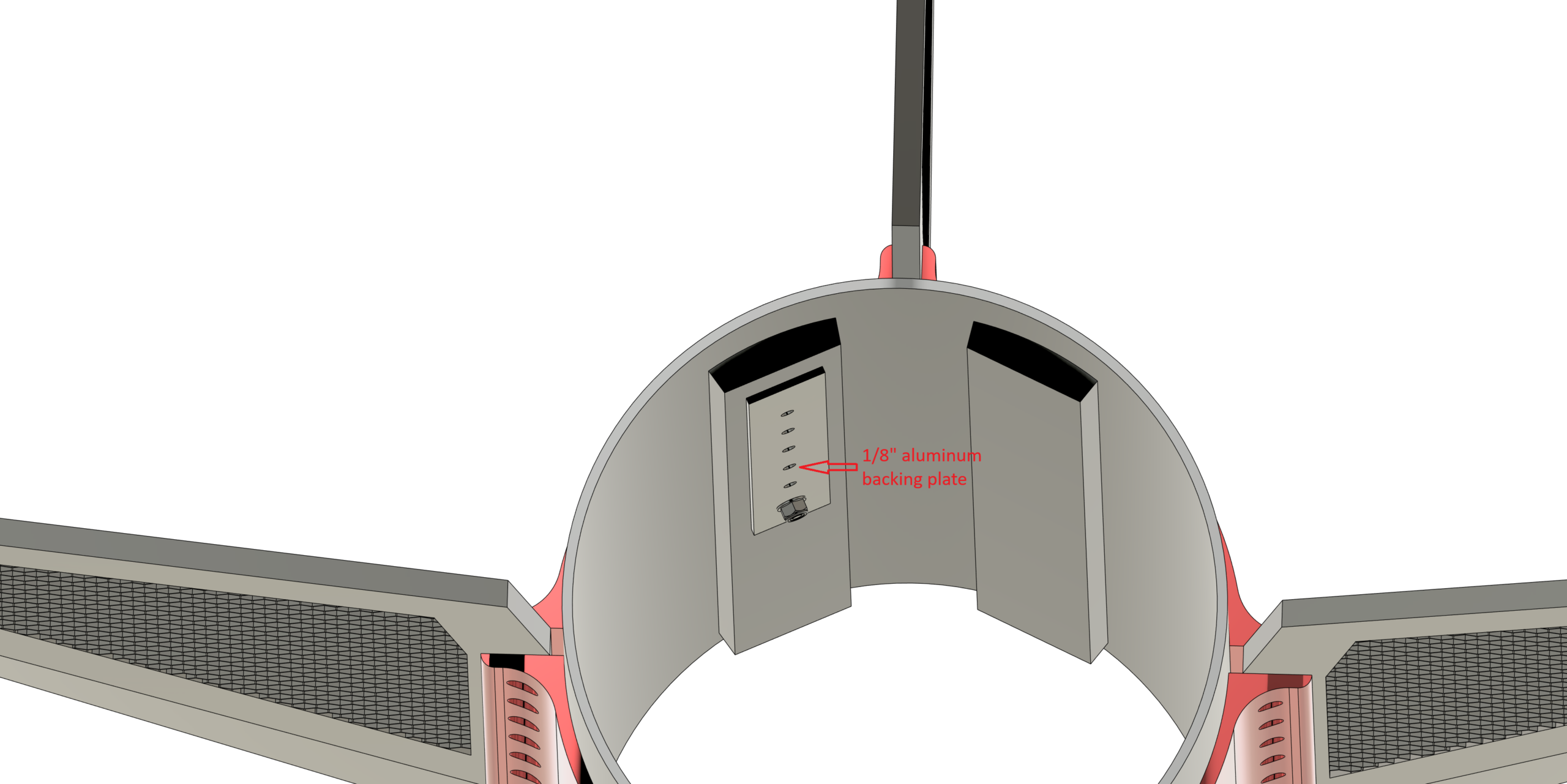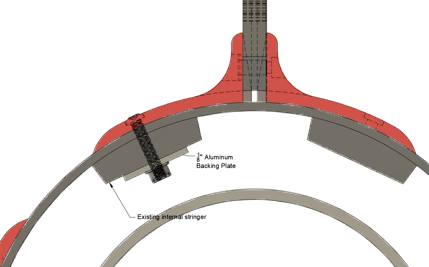 We will add an 1/8″ aluminum backing plate that spans the length of the internal stringers to distribute the clamping forces and point loads introduced by the bolts. This should eliminate the potential for shearing and also prevent the fiberglass airframe from cracking under load.